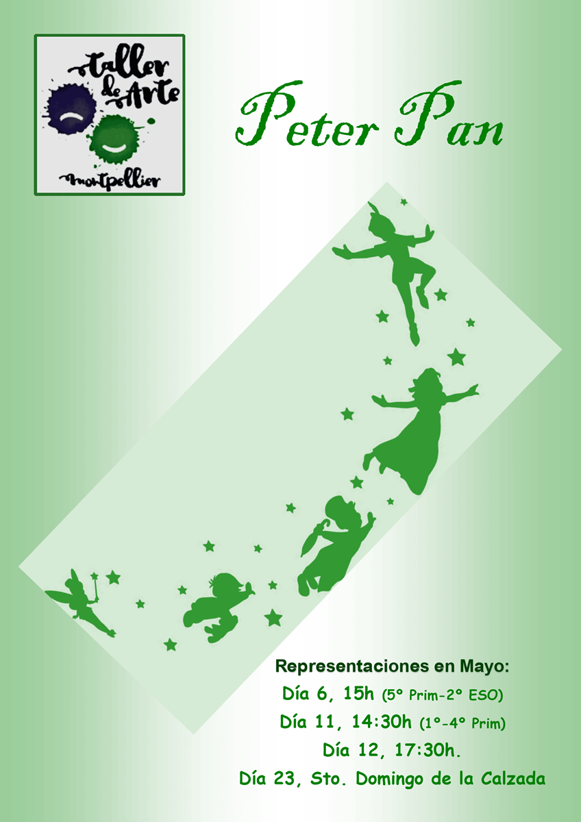 6 de mayo, miércoles, a las 15h: ACTUACIÓN PARA ALUMNOS. Venimos vestidos al cole con la camiseta verde del Taller y pantalón vaquero. Traemos el vestuario en una bolsa y lo dejamos en el Salón de Actos por la mañana. Los de ESO y Bach a las 13:10h salen para comer. Todos a las 14h vamos al salón para vestirnos. Salida a las 16:45h.